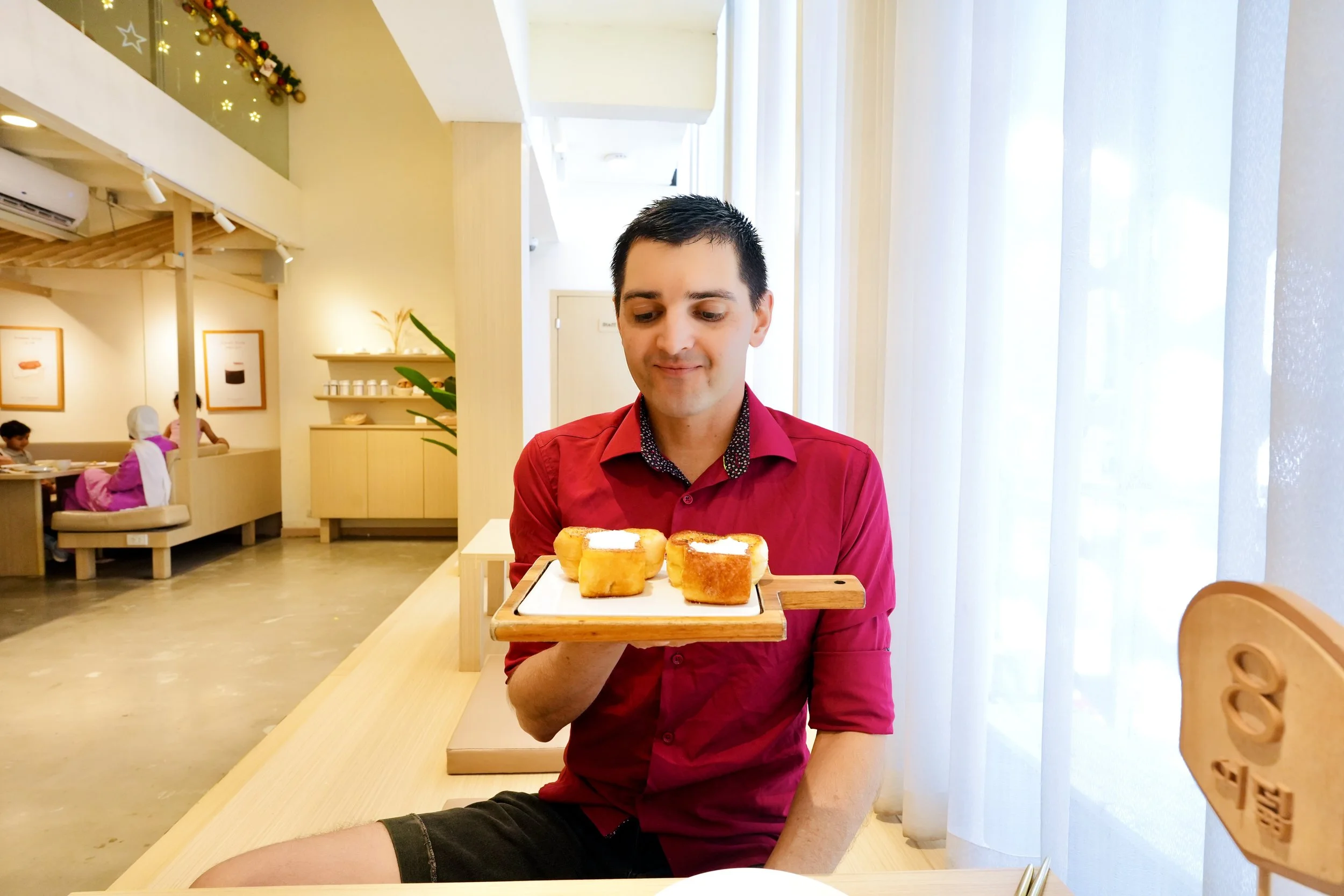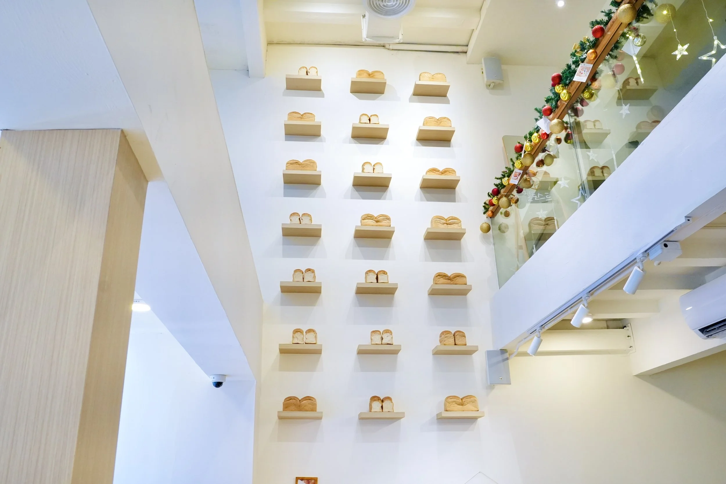Even the walls participate in the aesthetic. Rows of miniature wooden bread sculptures climb toward the ceiling, giving the space a childlike charm without disrupting its calm sophistication. It’s whimsical, but it stays elegant — a balance Bangkok cafés are uniquely good at striking. And then the toast arrives. It looks simple at first glance — two petite slices shaped like butterfly wings, dusted softly with powdered sugar. But the shape, the texture, the attention to detail all say the same thing: this café takes “toast” seriously.