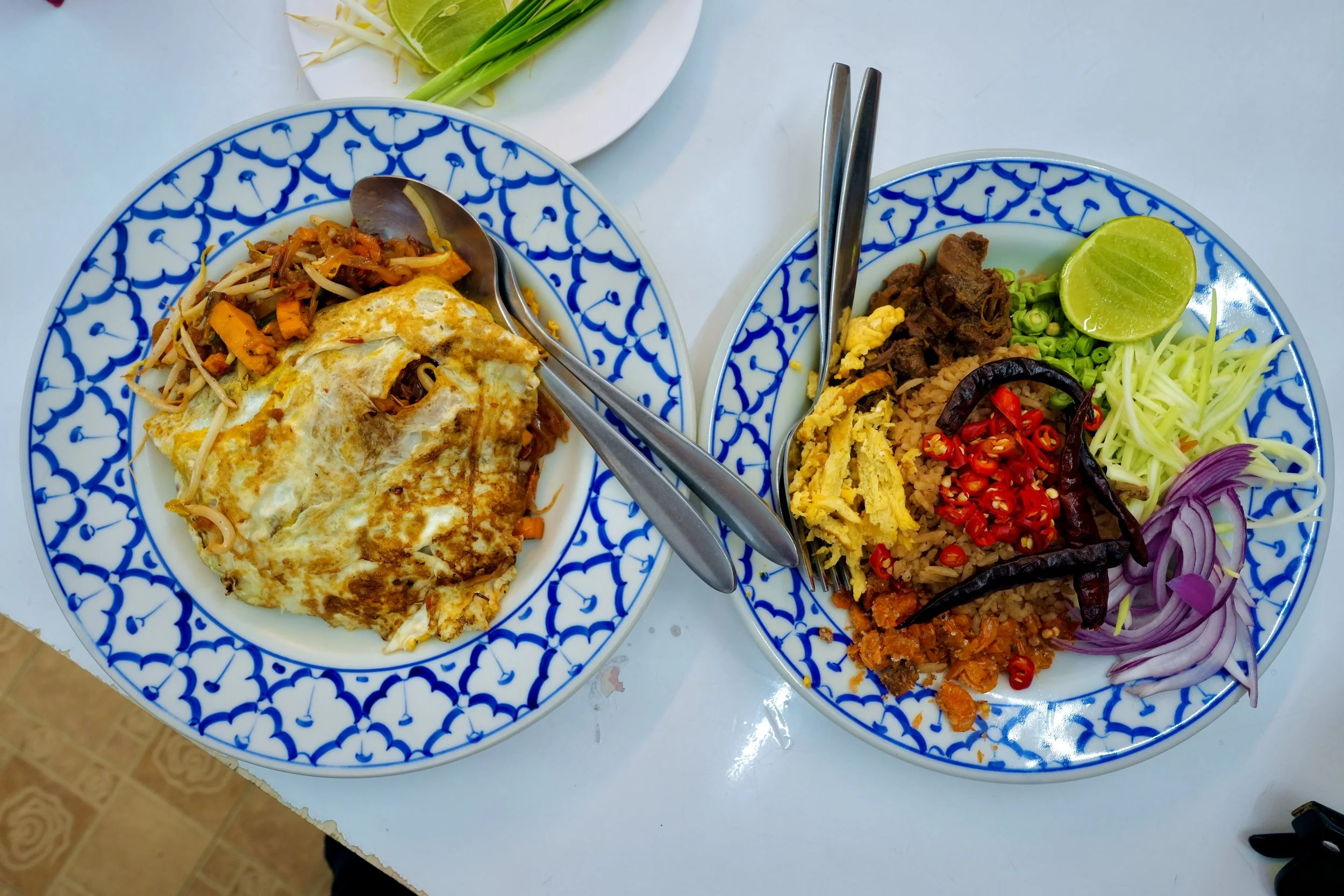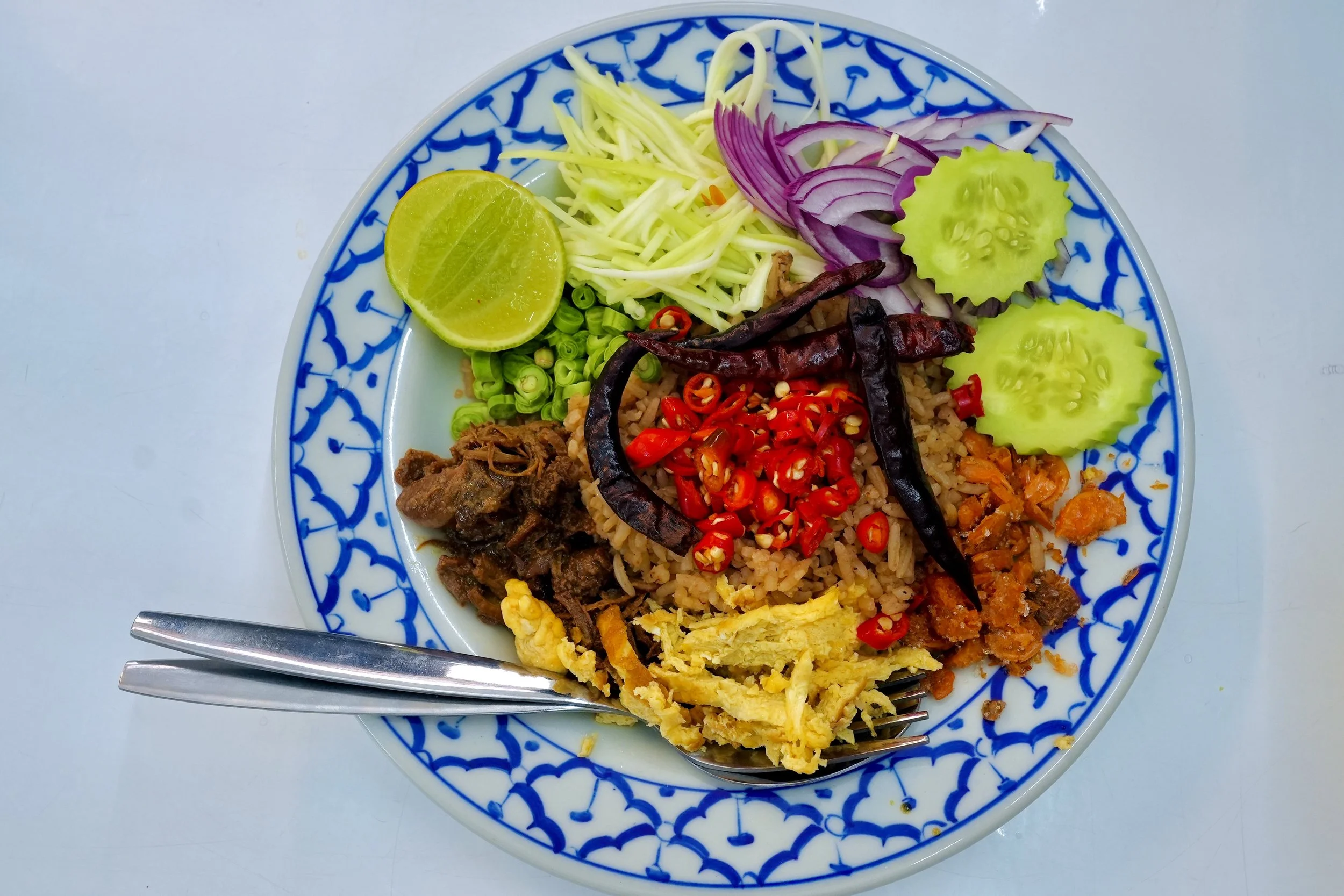 Khao Kluk Kapi looked like a painter’s palette: lime, mango, onion, long beans, dried chilies, shredded egg, sweet pork — each component waiting to be mixed into the rice.