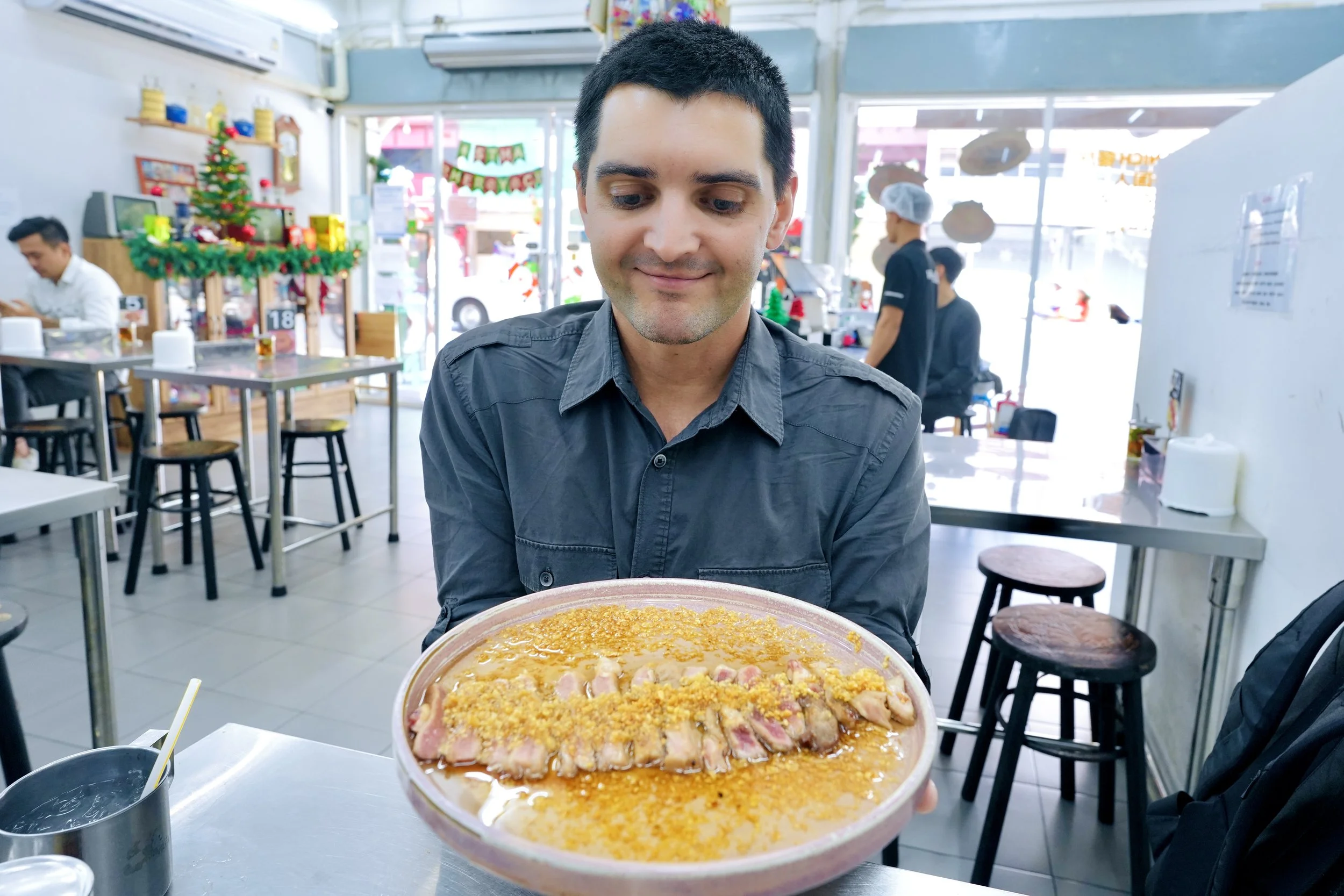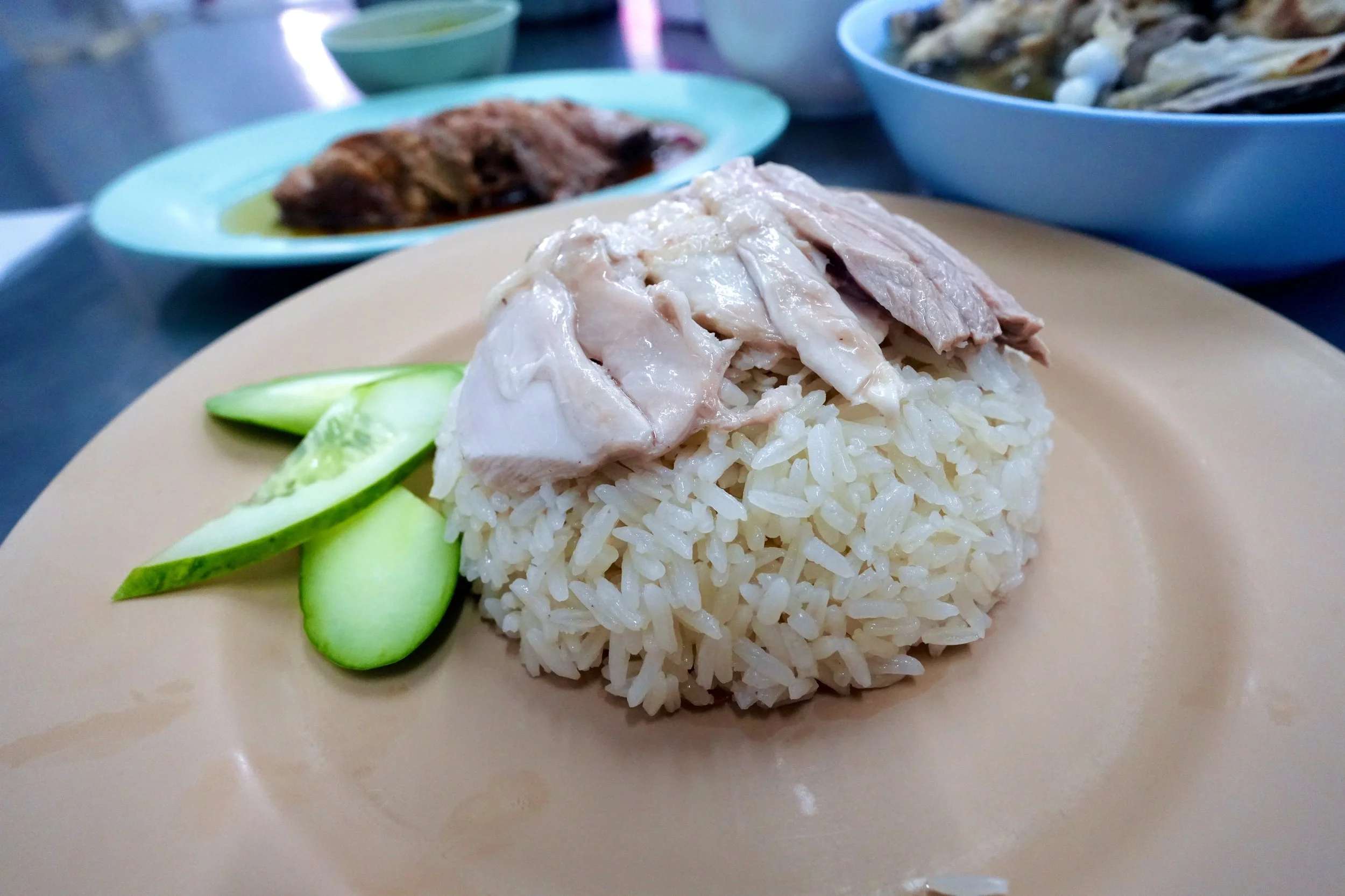 The chicken arrives soft and pale, glistening with broth, resting over rice so aromatic it almost steals the spotlight. It’s simple, humble, honest — the reason this place earned a Michelin Bib and the reason everyone here looks so content between bites.