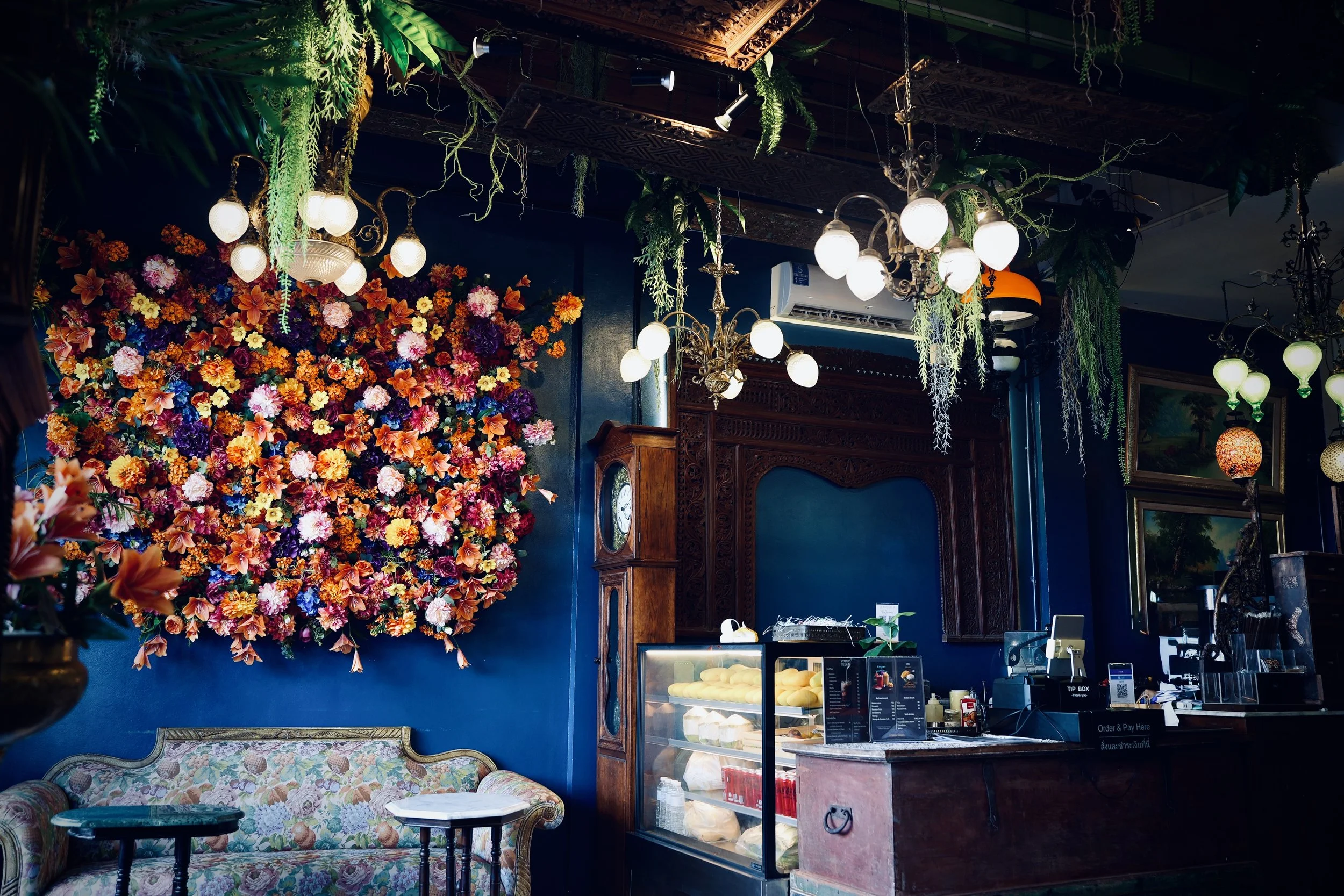 There are cafés that serve desserts, and then there are cafés that build entire worlds around them. Samphanthamitr feels like the latter — a theatrical space where chandeliers hang like floating moons and a wall of flowers glows against deep indigo paint. It’s the kind of place that makes you slow down before you’ve even seen the menu.