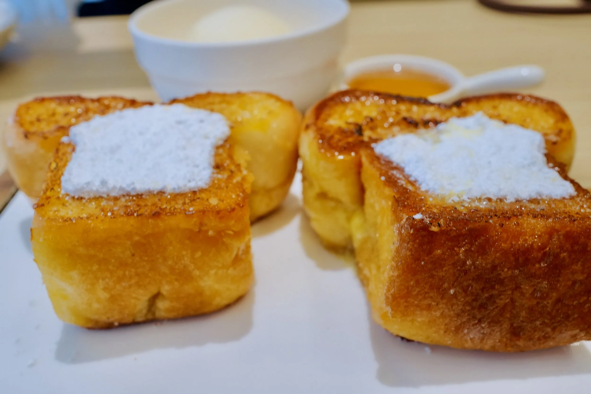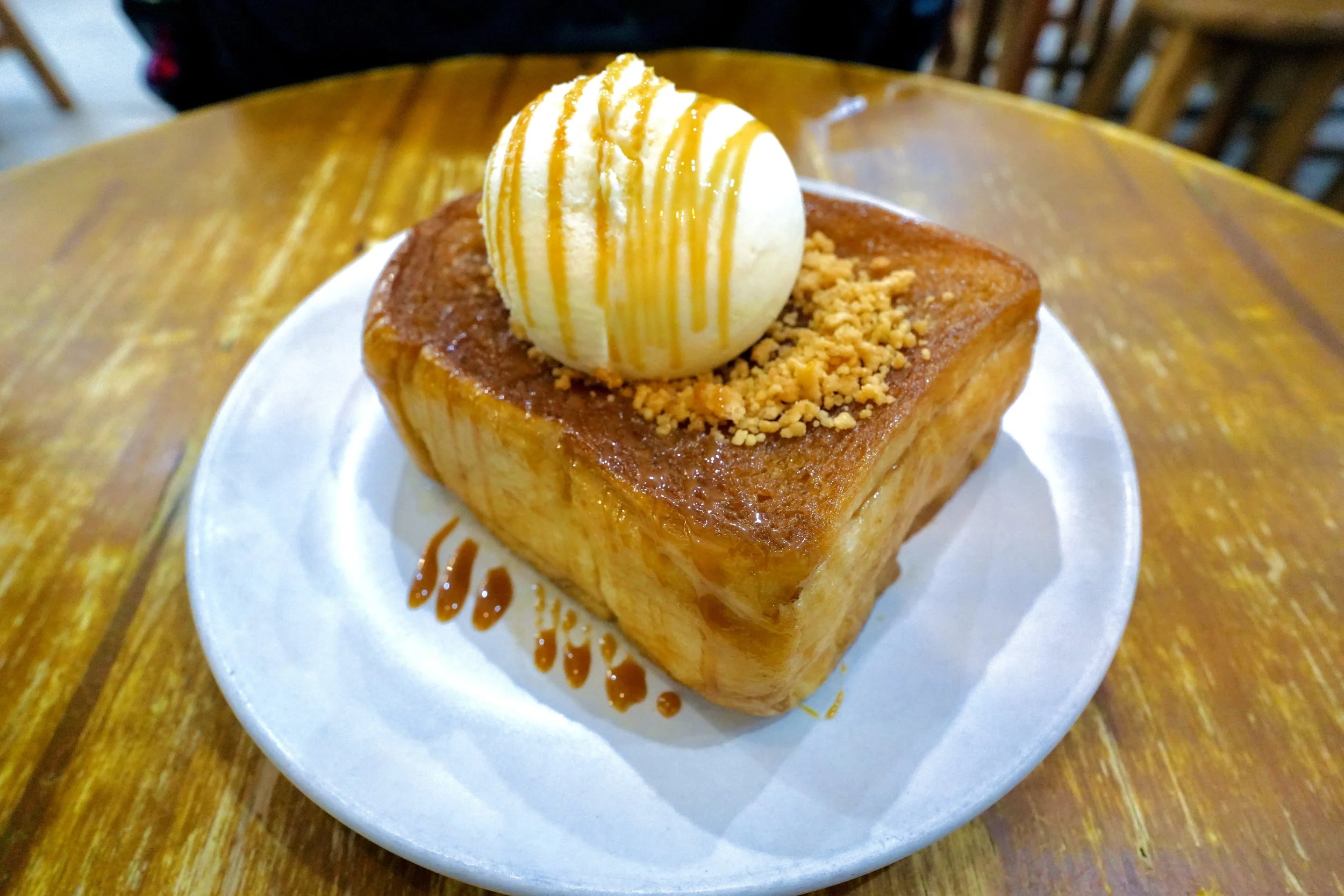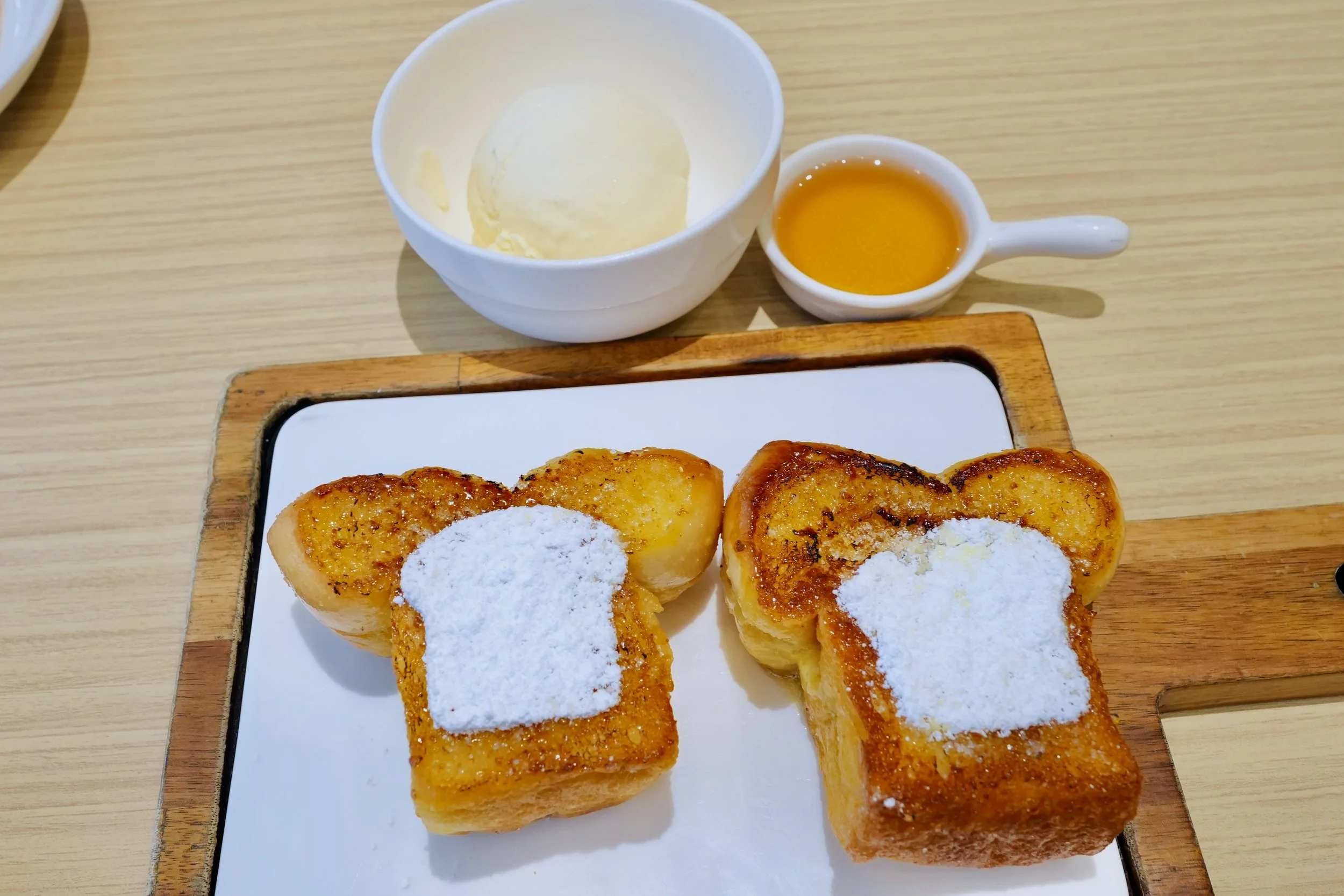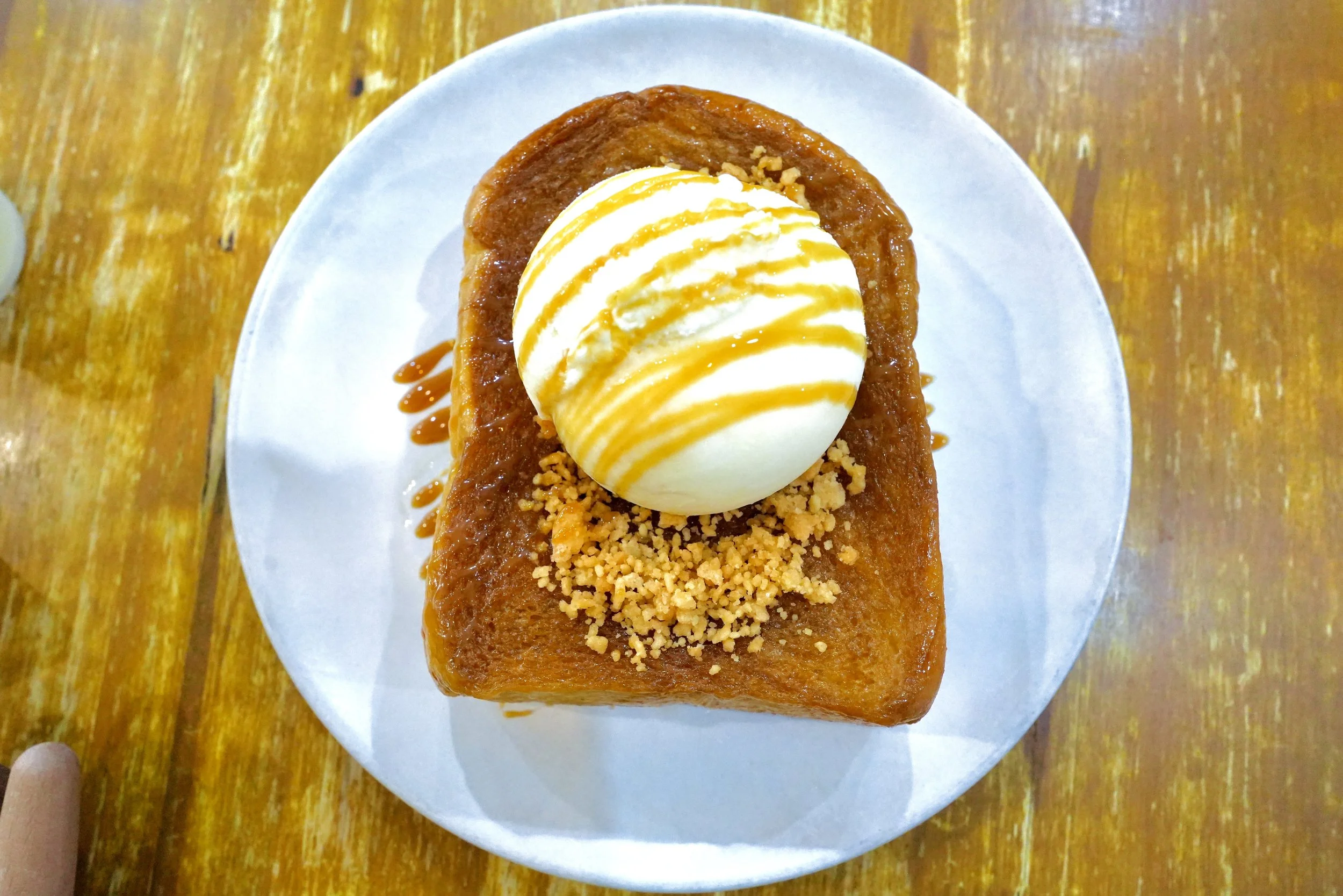 Up close, it becomes clear why this place is so loved. The toast is thick and custardy inside, crisp and buttery on the edges, and sweetened just enough to stand on its own. The honey and ice cream on the side are supporting actors — the toast is the star.