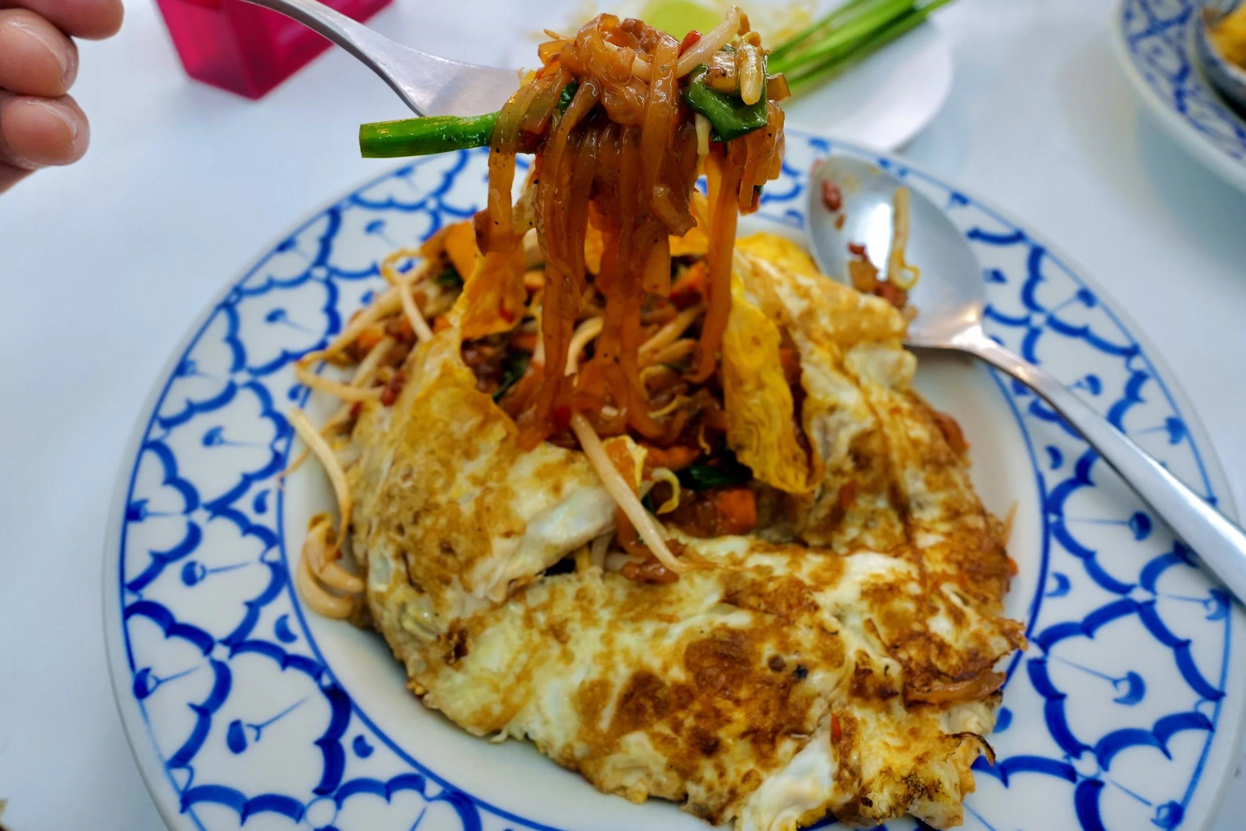 The Pad Thai came wrapped in a thin omelet, a bundle of sweet-savory noodles waiting inside. Each cut into the egg revealed steam and the aroma of tamarind and garlic.