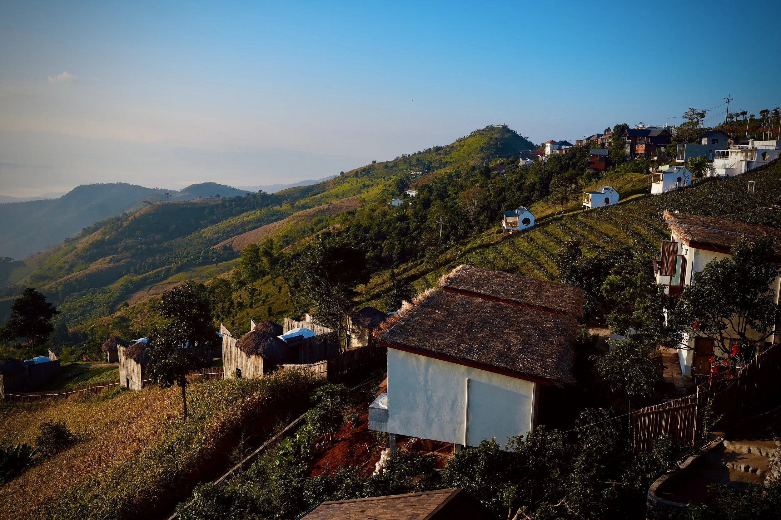 The structures scattered across the hills are modest — wood, thatch, tin roofs weighed down by stones. They’re positioned for practicality, not spectacle. Sunlight. Wind. Drainage. View. Everything serves a purpose.