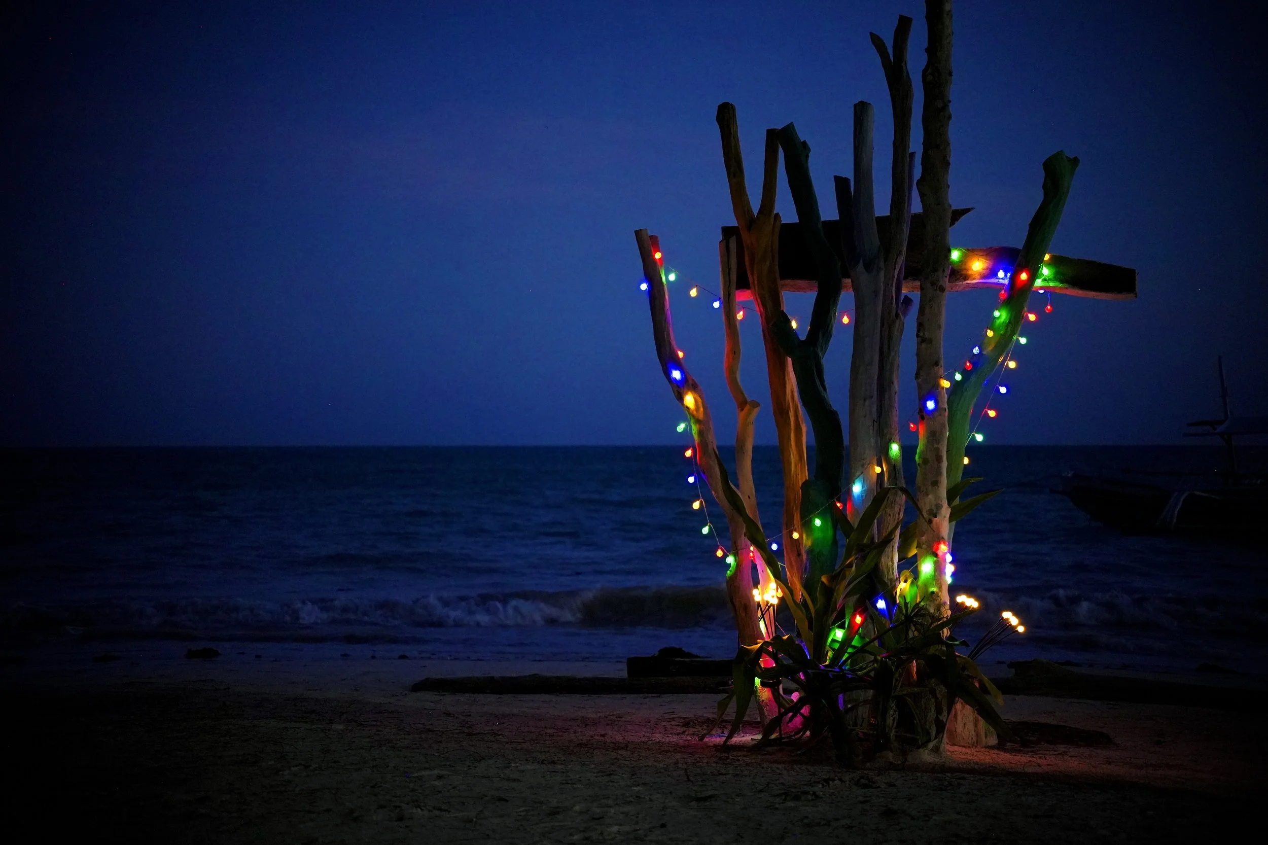 At the edge of camp, a wooden signpost glows beneath a string of colored bulbs. Its light flickers on the tide — a reminder that even in the most remote corners of the world, someone always leaves a small trace of welcome.
