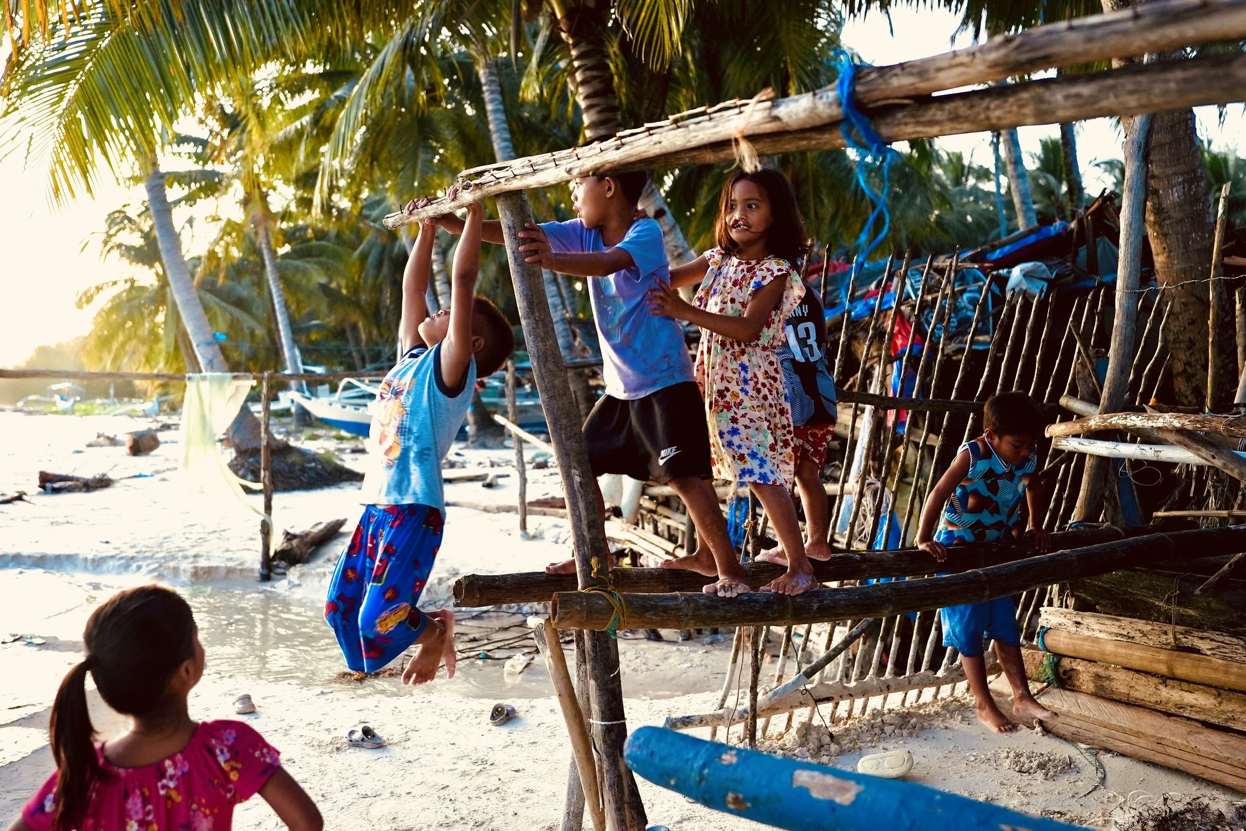 Their laughter drifts through the air, mingling with the smell of seaweed and woodsmoke. Bamboo scaffolds turn into makeshift playgrounds, each beam and rope transformed into a ladder to the sky. The entire camp hums with movement — a living, breathing mosaic of joy.