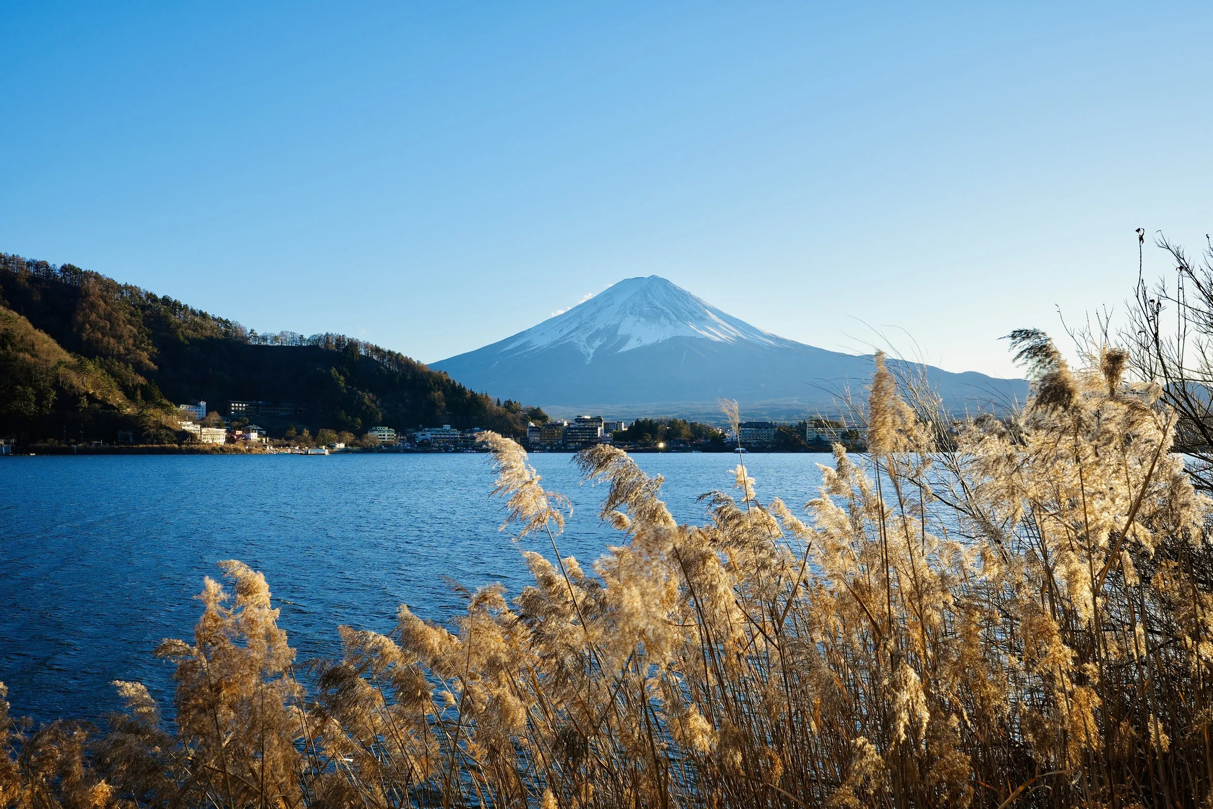 Two hours west of the capital, Mount Fuji rises 3,776 meters (12,389 feet) above sea level. The train ride from Shinjuku to Kawaguchiko compresses geography into a manageable dataset: urban density dissolving into open water and volcanic symmetry.