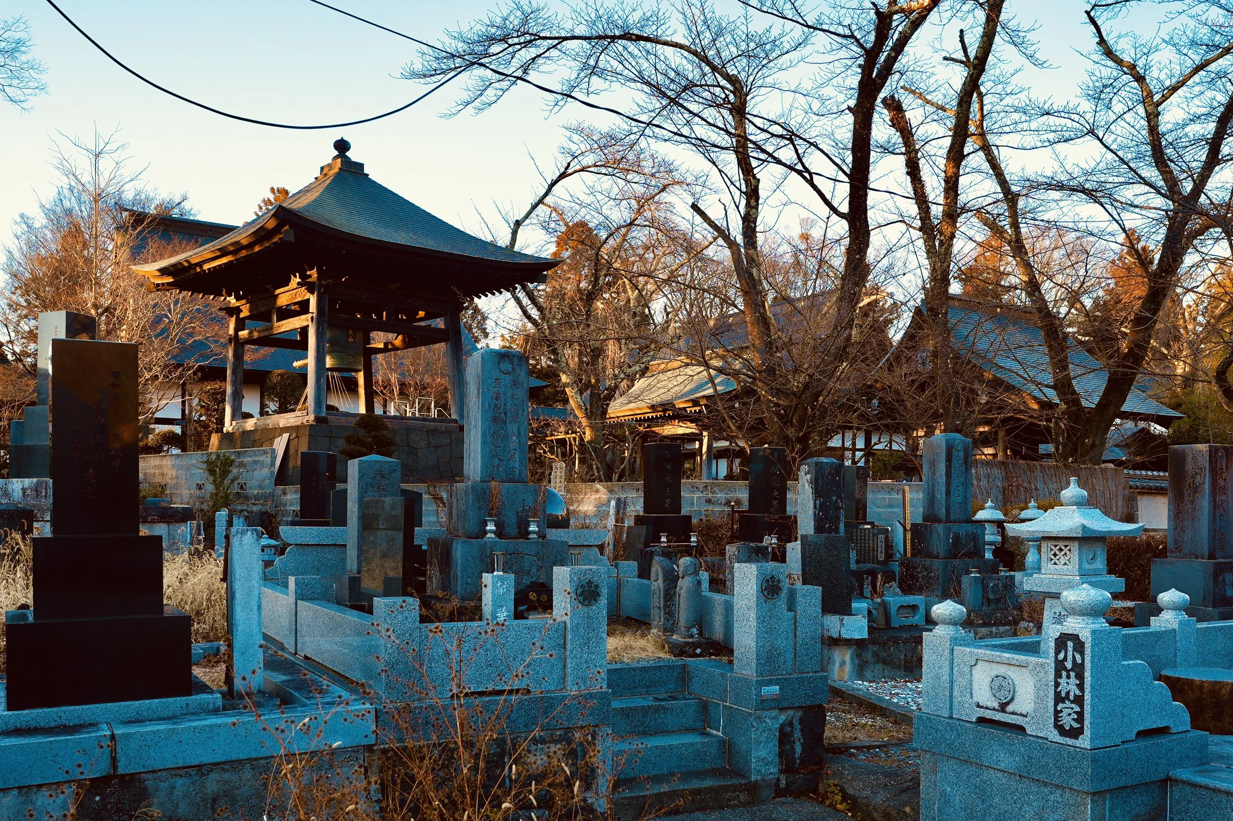 On the walk around the lake, I pass a cemetery. Stone markers rise in neat rows. A temple roof glows in late afternoon light.