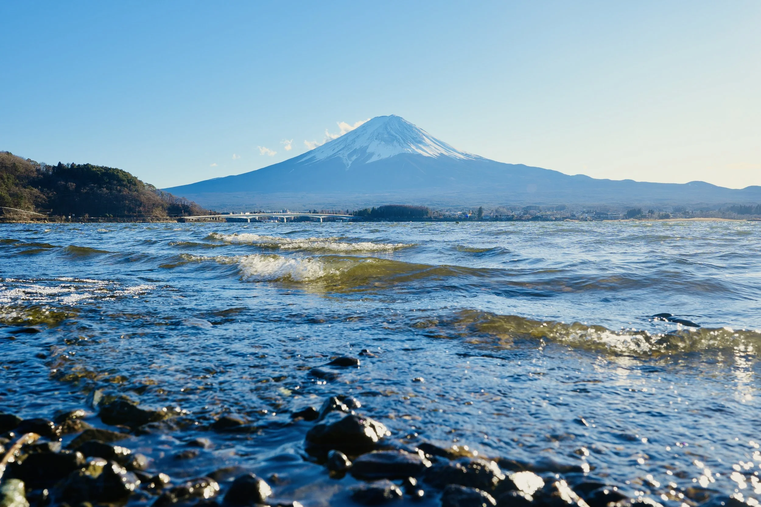 The wind pushes short, muscular waves toward the rocky shoreline. The surface fractures light into silver streaks. Fuji rises from the opposite side of the basin, occupying nearly half the visible horizon. The lake does not compete with the mountain — it frames it.