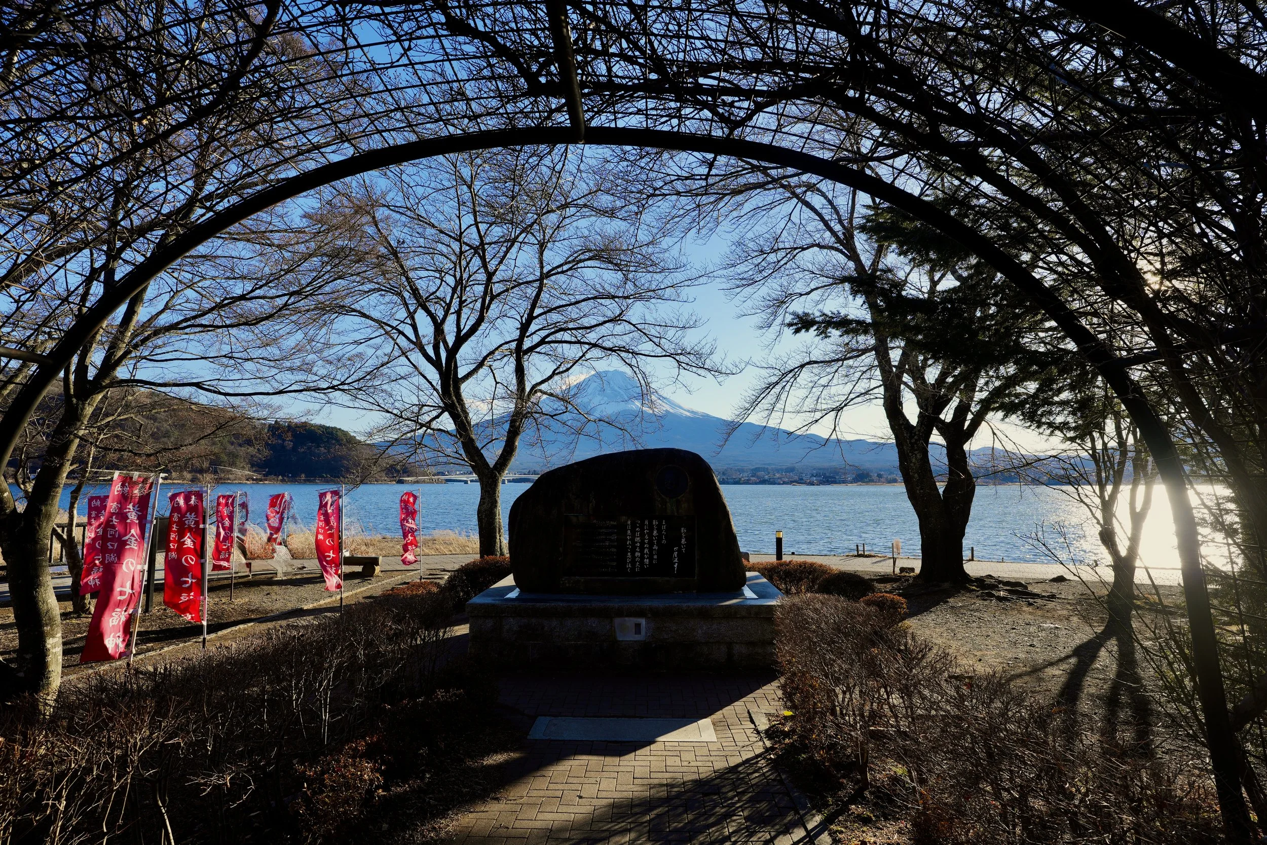 An iron arch covered in dormant vines frames Fuji like a deliberate composition. Red banners ripple along the lakeside path. The scene feels curated, but the mountain remains indifferent.